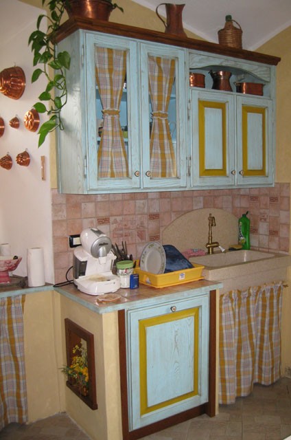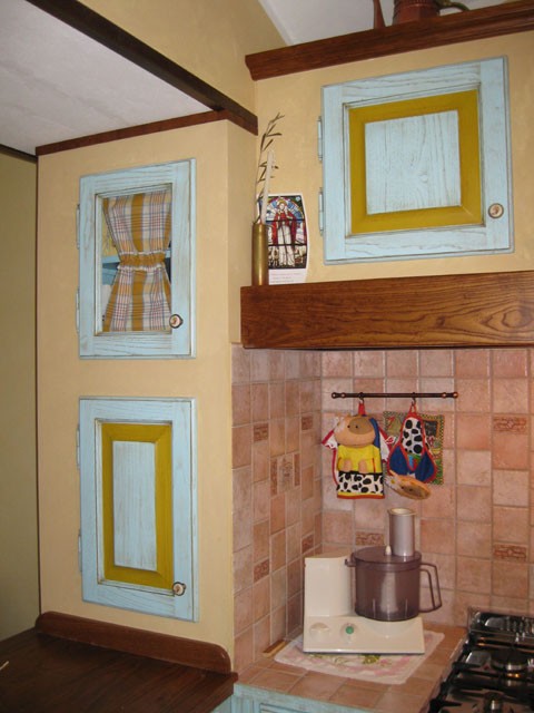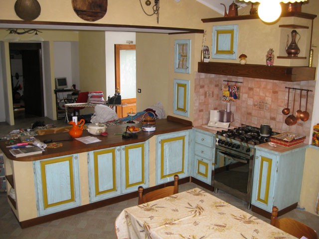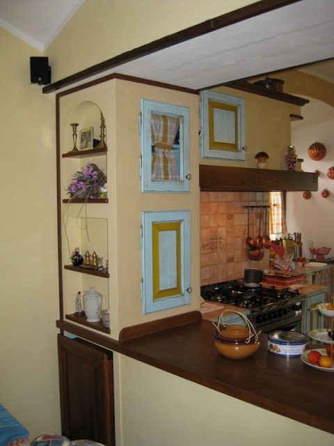 Cucina con parti in muratura realizzate in legno. Le ante in frassino. La finitura è in bicolore con in risalto la venatura del legno.