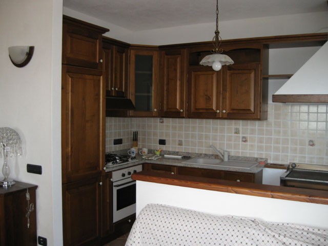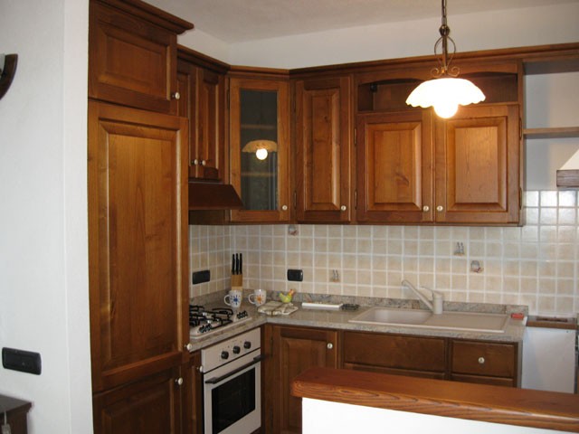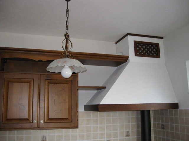 Cucina realizzata in legno con lavorazione particolare della cappa.