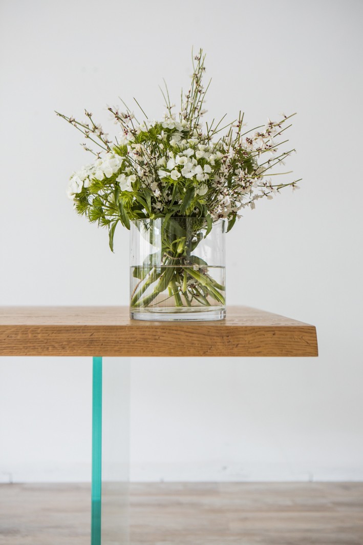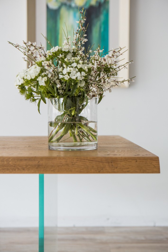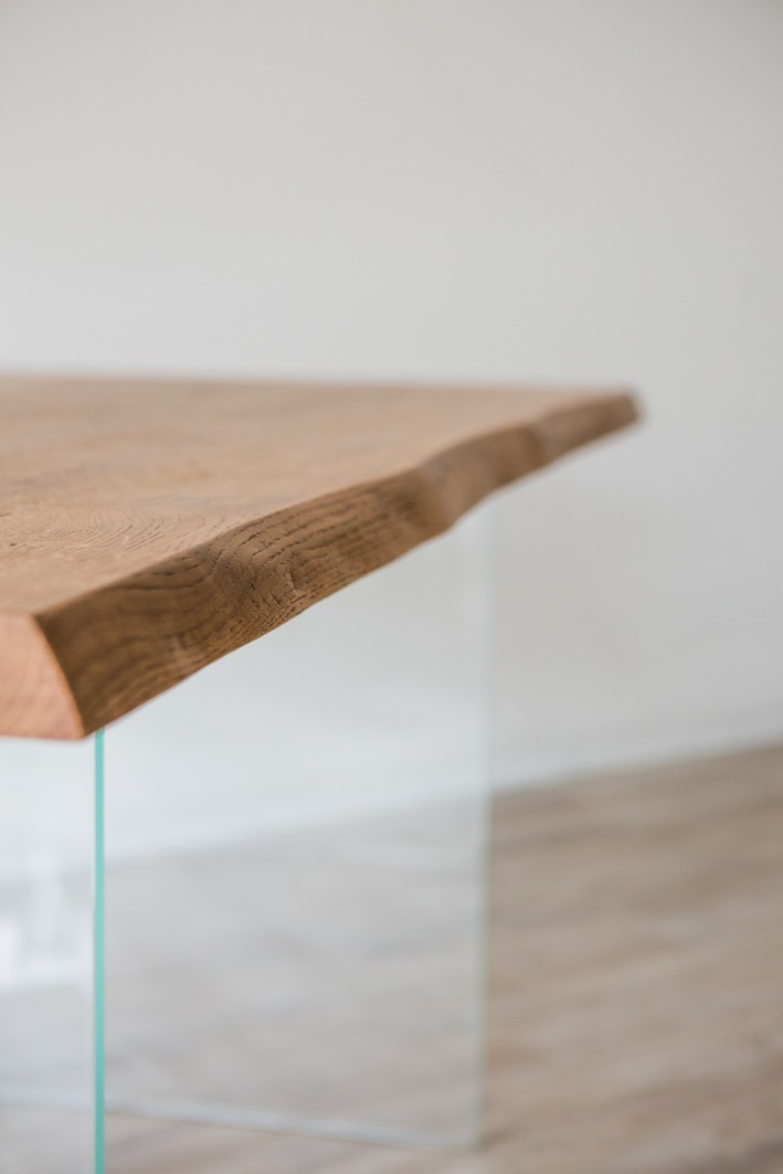 Il piano ha il bordo effetto tronco dell'albero, le gambe sono in cristallo trasparente. Ottima soluzione per abitazioni in qualche stile. Si abbina perfettamente con la nostra sedia regista in legno.