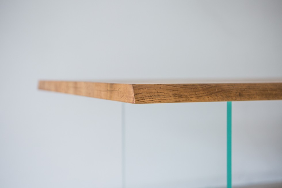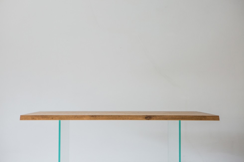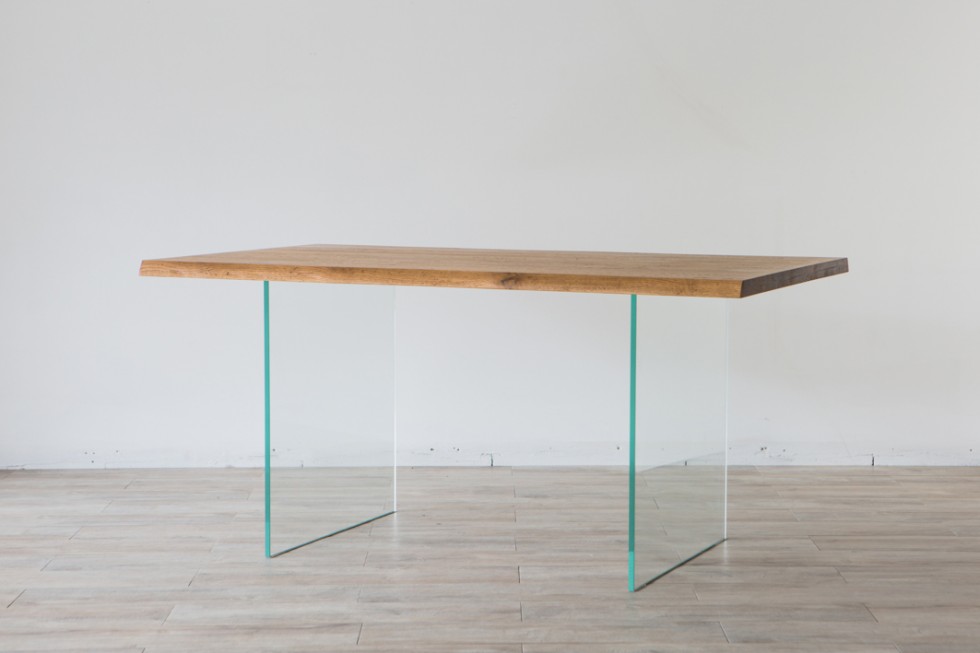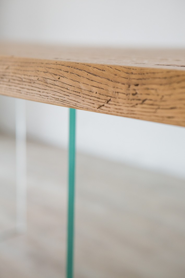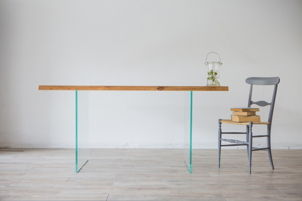 Questo tavolo moderno legno /vetro viene realizzato con piano in legno di castagno consumato e invecchiato e con gambe in cristallo trasparente.