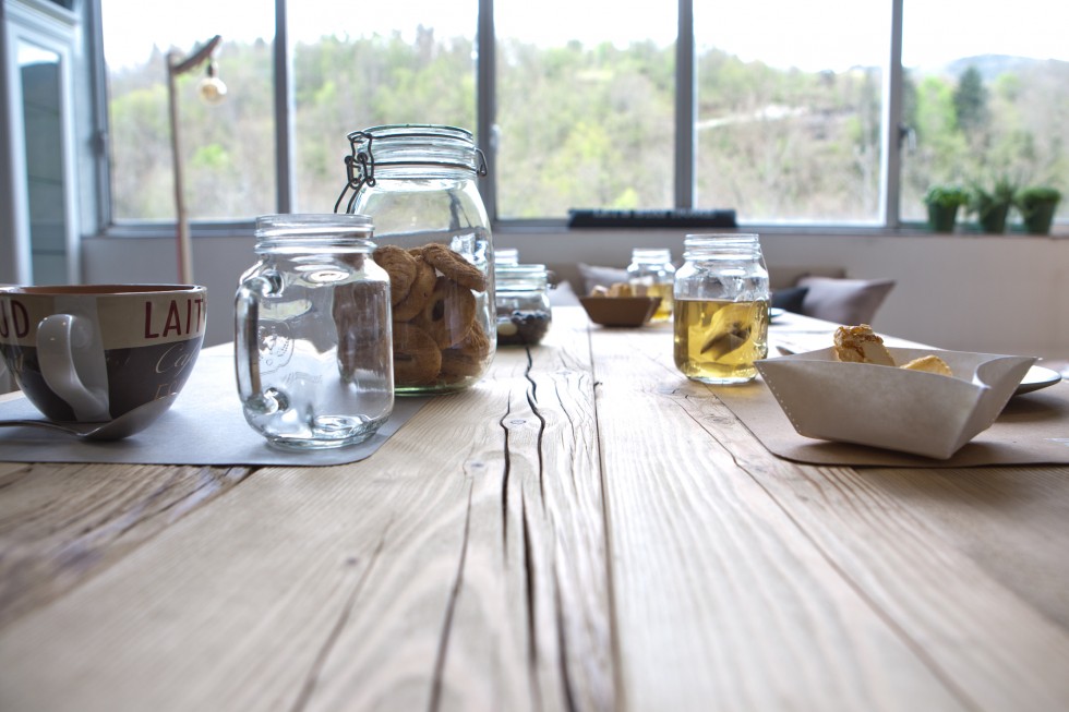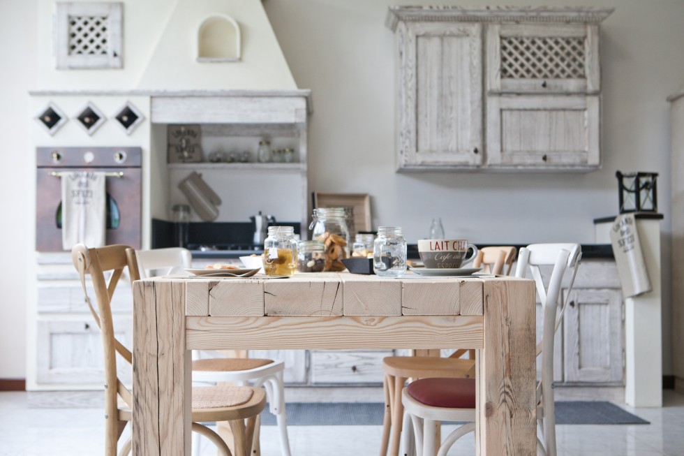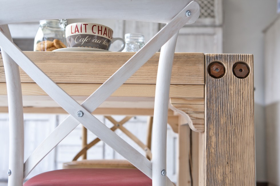 Tavolo artigianale in legno costruito con assi molto spesse in legno invecchiato.