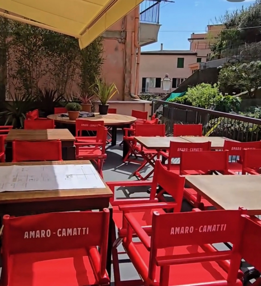 quel rosso intenso, carico di storia ligure, nel colore protagonista delle sedie da regista in un nuovo locale a Monterosso.