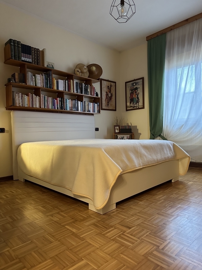 tinta noce dialogano con il comò e il letto in bianco, creando un equilibrio perfetto tra luce e materia.