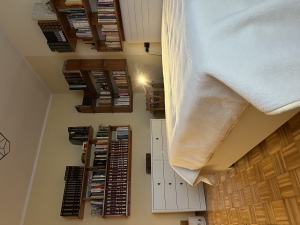 In questa camera da letto matrimoniale, il calore del legno naturale incontra la raffinatezza dei toni in contrasto: le librerie in