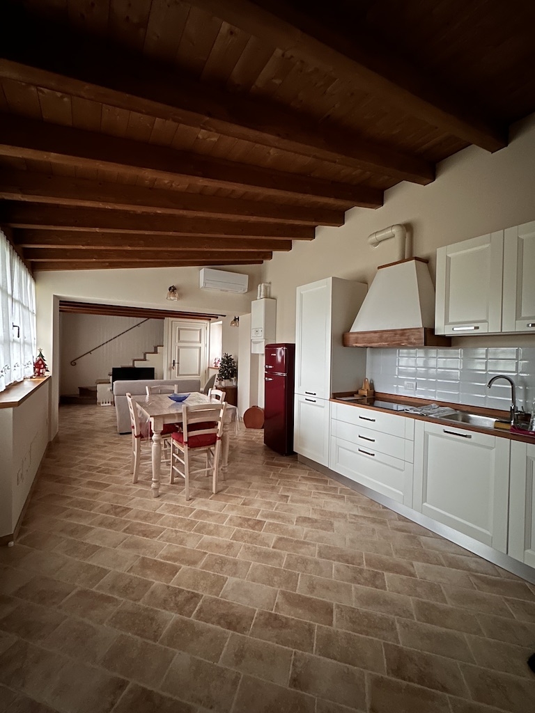 La cucina e il tavolo diventano il luogo delle condivisioni quotidiane, mentre quel frigorifero bordeaux, dona carattere e personalità all’ambiente.