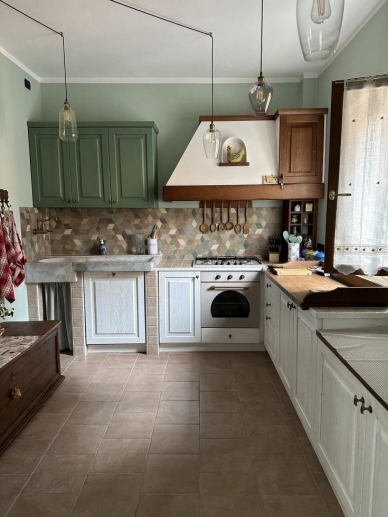 Cucina realizzata con parti in muratura che poi sono state rivestite con le piastrelle. Ideale per rustici in sasso