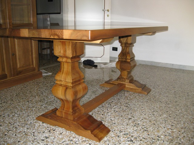 Tavolo con struttura a balaustra e con piano massiccio di noce. Finitura e misure a scelta.